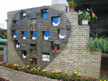 回收硅藻土制砖搭建的环保墙上,集中展示了青啤变废为宝的各种产品
