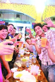 瞧,这一大桌子人在一起喝得有多High,你可能看不出来,他们之前可是不认识的两家人。不过人家说,既然能一起坐在青啤大世界里“哈酒”,那可叫缘分。啥都别说了,一口闷了吧!