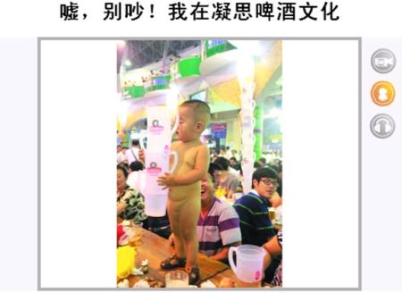 青啤大世界惊现 “裸男”,豪饮过后抱杯沉思……打住,瞎扯什么呢,这二岁的娃娃明明是在遐想酒文化!这个超级有“范儿”的小帅哥可是今天最抢镜的选手。
