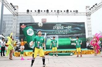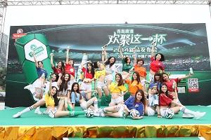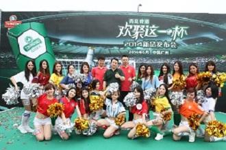 “为了足球,为了欢聚,让我们干杯!“, 5月12日下午广州万达仿佛置身于一场以“足球”之名的狂欢派对。伴随着激越的桑巴大鼓演奏,热辣的桑巴舞女,还有数十位衣着不同世界杯球队球衣的啦啦宝贝和花式足球的精彩表演,恒大球星李帅、刘健和青岛啤酒营销副总裁蔡志伟先生共同为青岛啤酒足球主题系列新品揭开了神秘面纱。青岛啤酒110年来始终在坚守严谨品质文化的同时,致力于将激情、快乐与分享的品牌感受传递给更多的消费者,在2014年这个‘全民皆球迷’的足球年里,青岛啤酒针对球迷的个性化需求进行“私人定制”,推出“足球罐”和“足球纪念铝瓶”两款新品,旨在为球迷朋友奉上更精彩的啤酒与足球的联袂盛宴,彰显球迷独特魅力。