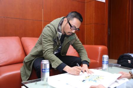 (图为张涵予为球迷签名崂山啤酒纪念T恤)