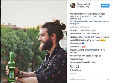 “Globalization=Chinese beer,French shirt,Viking beard and samurai bun”(全球化=中国啤酒,法国衬衫,维京胡子和日本发髻)。在照片分享应用Instagram上,意大利网友filippomelloni 刚“po出”在自家阳台与青岛啤酒的亲密照,瞬间“惊艳”朋友圈,收到好友3000多个好友点赞……
