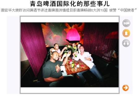 近几年青岛啤酒在澳大利亚的销量持续快速增长,今年1-7月,增长超过50%。今年6月,澳大利亚文化年在北京开幕,青啤是此次中澳文化交流的一个特殊“使者”,澳大利亚驻华使团来青访问也成为交流的一个重要环节。