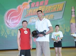 青岛啤酒股份有限公司营销总裁王瑞永(右一 )、易建联(左一)为青岛啤酒”激情联动深 圳“三人篮球赛总冠军颁奖