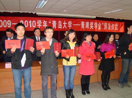 4月1日,“青岛啤酒?青岛大学2010年奖学金发放仪式”在青岛大学隆重举行。青岛市教育发展基金会理事长程友新、青岛啤酒公司副总裁姜宏、青岛大学副校长王焕良、青岛市教育局副局长张锡科等参加了奖学金发放仪式。